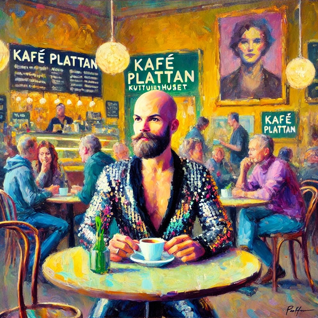 There’s something about the ritual of going to the theatre that I’ve always loved: meeting friends, grabbing a coffee, soaking in the excitement of a new production. This photo—taken 23 January 2025—captures exactly that. I’m sitting at Kafé Plattan, the vegan café tucked inside Kulturhuset in central Stockholm, wearing my black-and-silver sequin shirt from H\&M ✨. My friend Majsan and I met up there to catch up before heading to Stadsteatern for the dress rehearsal of *Stephen Sondheim’s COMPANY*.